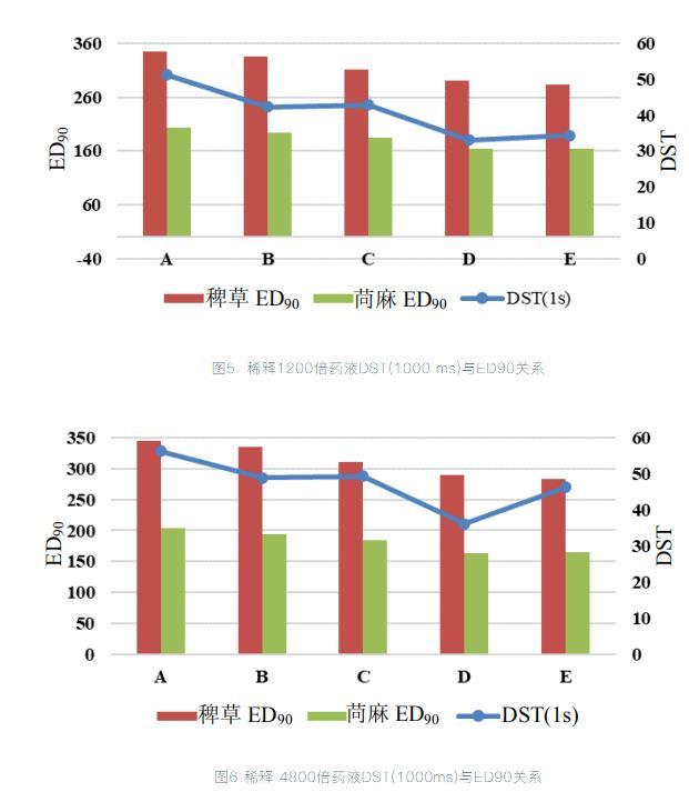 對(duì)于除草劑而言,藥液表面張力低于植物葉面潤(rùn)濕臨界值大概25 mN/m,藥液就可以由氣孔直接滲入表皮。對(duì)于稀釋600倍條件下,D配方的動(dòng)態(tài)表面力為23.14 mN/m,已經(jīng)低于雜草葉面的臨界值,那么藥液勢(shì)必更有效地滲透,藥效會(huì)更高,尤其對(duì)于葉片厚,蠟質(zhì)層稍厚的闊葉雜草會(huì)更加明顯。對(duì)于稀釋600倍條件下,E配方的動(dòng)態(tài)表面張力為31.28 mN/m,略高于葉面的臨界值,可能對(duì)于闊葉雜草的防效會(huì)有所下降。把藥液表面張力與靶標(biāo)表面張力關(guān)聯(lián),可以初步看出,藥液表面張力越接近雜草葉面臨界表面張力值,藥液防效會(huì)越優(yōu)秀,當(dāng)偏離程度大時(shí),除草活性會(huì)受到明顯影響。
