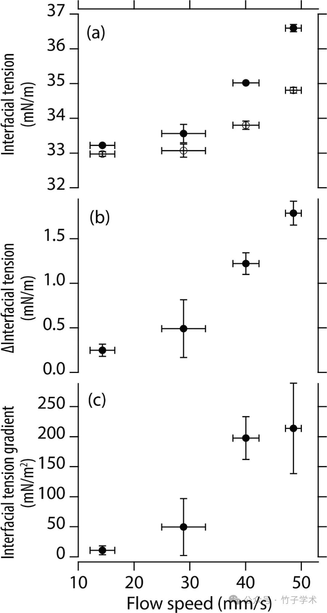 圖8是(a)液滴前面的系統界面張力的最大值(實心圓)和液滴前面的外推界面張力(空心圓)作為前端流速的函數。(b)上述最大值和前沿值之間的界面張力差與前沿流速的關系。(c)前沿流速與前沿界面張力梯度之間的關系。