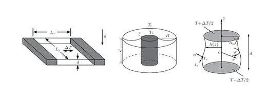 液層模型是源自于空間晶體生長(zhǎng)實(shí)驗(yàn)探索的簡(jiǎn)化模型,是研究微重力條件下界面張力梯度驅(qū)動(dòng)對(duì)流基本流動(dòng)規(guī)律的經(jīng)典模型。液層模型主要包括矩形液層(rectangular pool)、環(huán)形液層(annular pool)和液橋(liquid bridge)(圖1)等。相對(duì)而言,液橋是一類特殊的液層模型。液橋中界面張力梯度驅(qū)動(dòng)對(duì)流的流動(dòng)穩(wěn)定性研究成果極為豐富,相關(guān)系統(tǒng)的完整臨界轉(zhuǎn)捩描述詳見綜述(Hu et al.2008)。除了極薄液層的情況,在絕大多數(shù)界面張力梯度驅(qū)動(dòng)對(duì)流的地面實(shí)驗(yàn)研究中,界面張力效應(yīng)和重力效應(yīng)間存在較強(qiáng)的耦合作用。