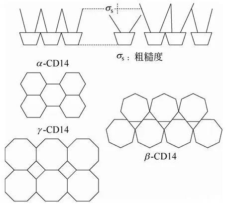 為了考察環(huán)糊精種類對(duì)所制備LB膜結(jié)構(gòu)的影響,Schalchli等用X-Ray反射技術(shù)對(duì)3種兩親性環(huán)糊精(α-、β-、γ-)在硅片上形成的LB單分子膜結(jié)構(gòu)進(jìn)行了研究。結(jié)果顯示,所有兩親性環(huán)糊精都在基底上形成了單分子層,但兩親性α-和γ-環(huán)糊精LB膜的結(jié)構(gòu)相似,而β-環(huán)糊精LB膜的結(jié)構(gòu)與前兩者有很大的不同。并且兩親性β-環(huán)糊精LB膜的粗糙度也遠(yuǎn)遠(yuǎn)大于兩親性α-和γ-環(huán)糊精。以上不同的原因緣于β-環(huán)糊精的七邊形環(huán)不同于α-,γ-環(huán)糊精的六或八邊形環(huán)是對(duì)稱結(jié)構(gòu),從而不能像α-,γ-環(huán)糊精那樣在基底上形成有序的結(jié)構(gòu),如圖1所示。類似地,Alexandre等用掃描力顯微鏡(scanning force microscopy)考察了兩親性α-,β-,γ-全疊氮基環(huán)糊精在云母片上的LB膜的結(jié)構(gòu)。無(wú)論在納米尺度還是在微米尺度下觀察,β-全疊氮基環(huán)糊精勻呈現(xiàn)出不同的形貌。