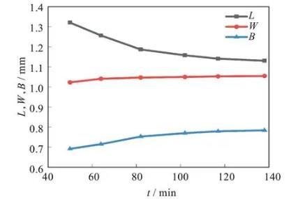 圖7為數(shù)值仿真過(guò)程中液滴三軸隨時(shí)間演化規(guī)律。綜合對(duì)比圖4和圖7,數(shù)值仿真軟件與實(shí)驗(yàn)過(guò)程中球形液滴的三軸長(zhǎng)度變化趨勢(shì)基本一致。可以看出,在體積保持不變的假設(shè)下,球形液滴的第二半軸和第三半軸變形頻帶是不一致的。該結(jié)果表明一些黏彈性液滴的變形和收縮不嚴(yán)格符合仿射變形假設(shè)(即第三半軸W始終等于第二半軸B),這與文獻(xiàn)結(jié)果類(lèi)似。數(shù)值仿真結(jié)果中液滴最終形態(tài)不是一個(gè)三軸長(zhǎng)度相等的球形,主要原因是仿真過(guò)程中使用的非牛頓流體的本構(gòu)模型只對(duì)黏性項(xiàng)進(jìn)行了修改,而忽視了彈性應(yīng)力的影響,因此與理論計(jì)算結(jié)果有一定誤差。