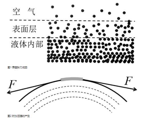 如圖1所示,表面張力的產生是由于液體分子力造成的.在液體內部,分子間距較小,分子力中引力和斥力平衡;但在液體表面由于揮發,分子間距增大,分子引力大于分子斥力,總體表現為引力,從而使得液面向內收縮。