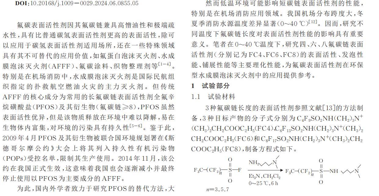 然而低溫環(huán)境可能影響短碳鏈表面活性劑的性能,特別是在機(jī)場(chǎng)消防應(yīng)用領(lǐng)域。我國(guó)機(jī)場(chǎng)分布跨度大,冬夏季消防水源溫度差異顯著(0~40℃)。因而,研究不同溫度下氟碳鏈長(zhǎng)度對(duì)表面活性劑性能的影響具有重要意義。筆者在0~40℃溫度下,研究四、六、八氟碳鏈表面活性劑(分別記為FC4、FC6、FC8)的表面活性、發(fā)泡性能、鋪展性能等主要理化性能,為氟碳表面活性劑在環(huán)保型水成膜泡沫滅火劑中的應(yīng)用提供參考。