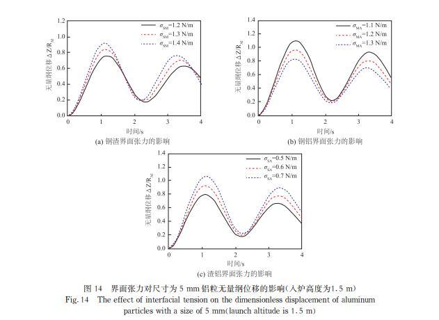 增加鋼渣界面張力、減小鋼鋁界面張力或增加渣鋁界面張力有利于鋁粒進入鋼液,而鋁粒的尺寸大于20 mm,界面張力對鋁塊運動幾乎沒有影響;增大密度會使鋼芯鋁在鋼液中停留更長時間,有利于鋼液脫氧。