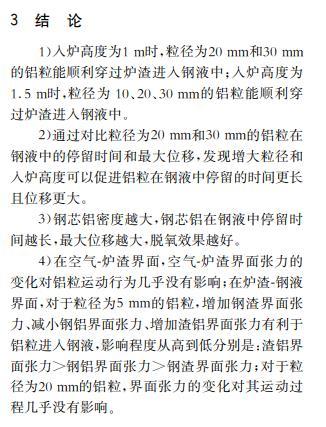 結果表明:在渣層厚度為70 mm且入爐高度為1~1.5 m的情況下,1 mm和5 mm的鋁粒在渣鋼界面處波動;入爐高度為1 m時,粒徑為10 mm的鋁粒停留在渣鋼界面處,但在入爐高度為1.5 m及以上時可以進入鋼液;20 mm及以上尺寸的鋁粒可以進入鋼液。在入爐高度為1 m時、30 mm尺寸的鋁粒在鋼液中的停留時間與深度相較于20 mm的基礎上分別增加22.86 %和50.00 %;在鋁粒尺寸為20 mm時、入爐高度為1.5 m時的鋁粒在鋼液中的停留時間與深度在1 m的基礎上分別增加5.71 %和10.00 %。
