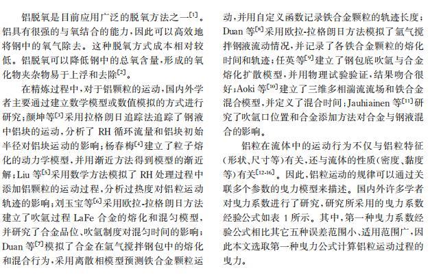 摘要: 二次精煉過程中,鋁是鋼液進行脫氧及合金化的主要物料之一,但純鋁的密度小于鋼液,能否穿越渣層與鋼液接觸及接觸時間對鋁的脫氧效果和鋼中溶解鋁的含量有直接影響。在忽略鋁的熔化、溶解及化學反應的情況下,通過對鋁粒運動過程受力分析,建立鋁粒在氣-渣-鋼相內的三維運動數學模型,明晰鋁粒尺寸及入爐高度對鋁粒運動軌跡的影響。