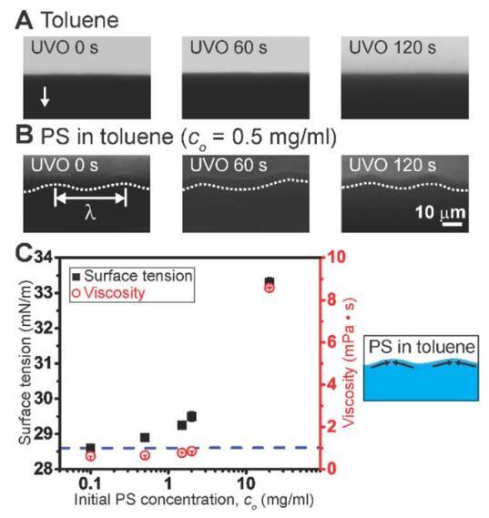 雖然熱 Marangoni 效應(yīng)是次要的 對(duì)于我們的工藝,如甲苯的穩(wěn)定性所示 在圖 2(A) 中沒有 PS 的彎液面,我們相信 溶質(zhì) Marangoni 效應(yīng)在超支化結(jié)構(gòu)的形成中起著重要作用(圖 2B)。 支持 這個(gè)假設(shè),我們注意到彎月面前沿,顯示在 圖 2(A,B),僅顯示甲苯的直線和 甲苯中 PS 的正弦波表明溶質(zhì) 馬蘭戈尼效應(yīng)比熱馬蘭戈尼效應(yīng)更重要。 產(chǎn)生的溶質(zhì) Marangoni 效應(yīng) 通過濃度梯度引起的表面張力梯度,24 是濃度局部波動(dòng)的結(jié)果 聚苯乙烯[圖。 2(C)]。