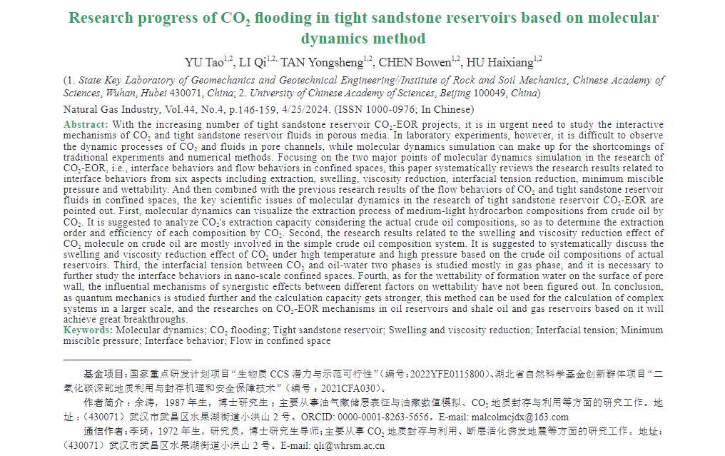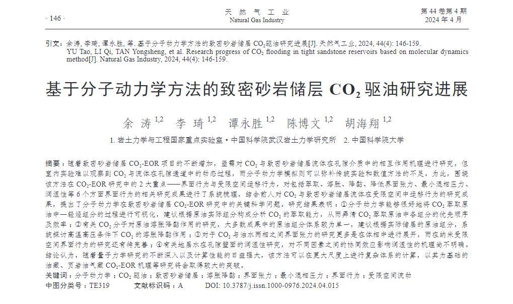 隨著致密砂巖儲層CO2-EOR項(xiàng)目的不斷增加,亟需對CO2與致密砂巖儲層流體在孔隙介質(zhì)中的相互作用機(jī)理進(jìn)行研究,但室內(nèi)實(shí)驗(yàn)難以觀察到CO2與流體在孔隙通道中的動態(tài)過程,而分子動力學(xué)模擬則可以彌補(bǔ)傳統(tǒng)實(shí)驗(yàn)和數(shù)值方法的不足。為此,圍繞該方法在CO2-EOR研究中的2大重點(diǎn)——界面行為與受限空間運(yùn)移行為,對包括萃取、溶脹、降黏、降低界面張力、最小混相壓力、潤濕性等6個(gè)方面界面行為的相關(guān)研究成果進(jìn)行了系統(tǒng)梳理,結(jié)合前人對CO2與致密砂巖儲層流體在受限空間中運(yùn)移行為的研究成果,提出了分子動力學(xué)在致密砂巖儲層CO2-EOR研究中的關(guān)鍵科學(xué)問題。