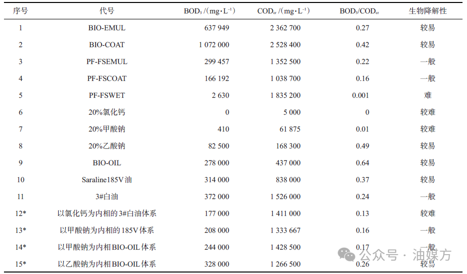 表1降解性數據注:標*的樣品配方為:240 mL基液+20 g/L BIO-EMUL+15 g/L BIO-COAT+60 mL內相鹽溶液。