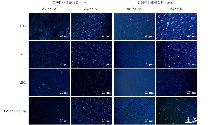 圖5為結構型洗滌劑的偏光紋理圖(表2中的配方,以“主表面活性劑—總活性物質量分數—HS-PA質量分數”區分)。從圖中可以明顯看出,在分別以LAS、AES和AEO9為主表面活性劑的配方中,當總活性物質量分數約為15%或者25%時,加入HS-PA后,偏光圖像中的馬耳他十字液晶形狀均明顯增多。馬耳他十字是球形層狀液晶的典型織構,說明了HS-PA的加入有利于體系形成球形層狀液晶。當體系中不含HS-PA時,偏光視野并非完全暗場,而是有微弱的油狀條紋或者少量的馬耳他十字,表明其中也具有部分平面或者球形層狀液晶結構,但液晶較弱。不同主表面活性劑的層狀液晶結構存在一些區別,AEO9為主表面活性劑的配方,其十字花紋理直徑為2~3μm,小于LAS、AES以及三元表面活性劑平衡體系的十字花紋理直徑(7~10μm)。以上結果與HS-PA復配體系中的粒徑分布變化相吻合:當HS-PA與低分子量表面活性劑復配時,LAS/AES與HS-PA的混合膠束粒徑明顯變大,但AEO9與HS-PA的混合膠束粒徑只略微變大。根據球形層狀液晶的結構可知,其內部混合膠束粒徑越大,則相應的液晶粒徑越大。對于除AEO9外的其他3種體系而言,總活性物質量分數從15%提高到25%,HS-PA加量從2%增加至5%,球形層狀液晶的粒徑會相應增大,此現象在LAS為主表面活性劑以及LAS較多的三元表面活性劑平衡體系中更為明顯。