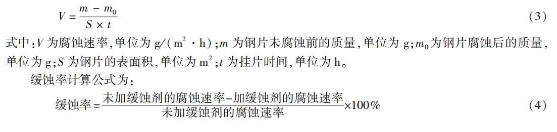 酸化是油氣田增產增注的重要措施之一,在石油工業中得到了廣泛的應用。酸化使用的酸液注入地層的過程會嚴重腐蝕地面管道及井筒管壁,而且Fe3+會對地層產生永久損害,所以酸液中必須加入緩蝕劑。本實驗參照《酸化用緩蝕劑性能試驗方法及評價指標》,采用靜態掛片法,對已提純的合成產物BQAS進行緩蝕性能研究。掛片法是在實驗室給定條件下,通過用試片的質量損失計算出腐蝕速率和緩蝕率,來研究緩蝕劑緩蝕性能的方法。