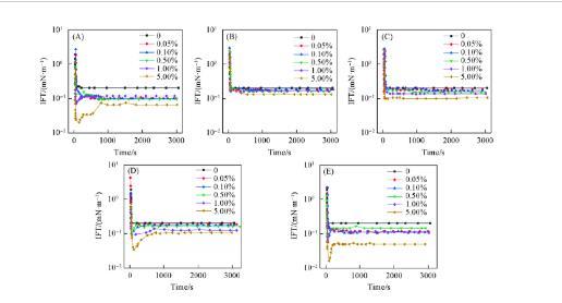 從圖4(A),(D)和(E)可見,A,A3和A4的DIFTs變化趨勢與濃度密切相關。隨著瀝青質及其亞組分濃度的逐漸增加,DIFTs曲線由“L”型轉變?yōu)椤癡”型。這一有趣的結果是由活性分子在界面上呈現不同的排列方式引起的。當油相與水相接觸時,水相中的p-S14-4分子和油相中的界面活性分子都迅速擴散到界面并形成混合吸附膜。