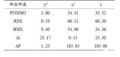 將表1中的接觸角測試結果代入式(2)中,利用Owens——Wendt——RabelandKaelble(OWRK)擬合得到PNIMMO及推進劑組分的表面張力,如表2所示。5種樣品的表面張力大小順序為:γ(AP)>γ(RDX)>γ(HMX)>γ(PNIMMO)>γ(Al),其中PNIMMO、RDX、HMX和AP中表面張力的極性分量γp均遠大于色散分量γd,說明其表面張力中極性分量貢獻更多;而相反Al粉表面張力中色散分量對其表面張力作主要貢獻。一般而言,當粘合劑的表面張力小于推進劑中單質固體組分的表面張力時,粘合劑才能較好地包覆于推進劑表面。PNIMMO的表面張力為35.52mN/m,明顯小于RDX、HMX及AP的表面張力,說明PNIMMO比較容易鋪展于其他固體物質表面。即PNIMMO對RDX、HMX和AP3種固體組分的包覆效果良好。