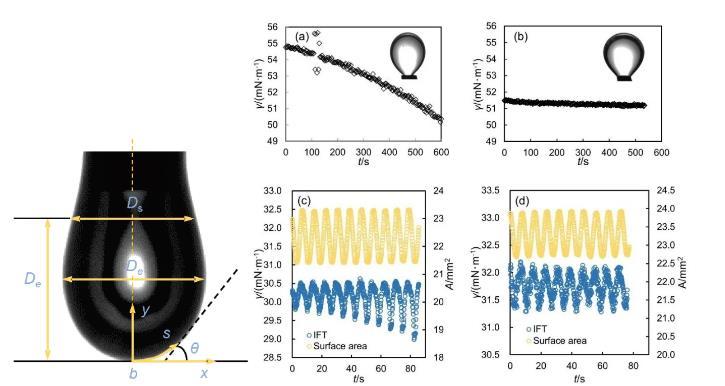 研究團(tuán)隊(duì)優(yōu)化了從樣品預(yù)處理、儀器改進(jìn)、實(shí)驗(yàn)測(cè)量到數(shù)據(jù)分析的全流程,提供了詳細(xì)的實(shí)驗(yàn)操作指南,涉及液滴控制、系統(tǒng)校準(zhǔn)和光學(xué)干擾處理等關(guān)鍵步驟。通過(guò)對(duì)氣水兩相和氣水油三相體系實(shí)際測(cè)量的有效數(shù)據(jù)和無(wú)效數(shù)據(jù)的展示和分析,驗(yàn)證了方法的有效性和準(zhǔn)確性。整套實(shí)驗(yàn)流程可基于不同實(shí)際條件在數(shù)天內(nèi)完成。圖2動(dòng)態(tài)懸滴表征(左圖);界面張力及界面流變性實(shí)驗(yàn)測(cè)量數(shù)據(jù)(右圖)本研究為界面性質(zhì)的測(cè)定樹立了新的標(biāo)準(zhǔn),通過(guò)優(yōu)化動(dòng)態(tài)懸滴表征方法,極大地提高了測(cè)量的可靠性和精度,體現(xiàn)了方法學(xué)創(chuàng)新;不僅對(duì)界面科學(xué)的基礎(chǔ)理論發(fā)展具有重要推動(dòng)作用,同時(shí)為材料科學(xué)、化學(xué)工程、環(huán)境科學(xué)等領(lǐng)域的實(shí)際應(yīng)用提供了技術(shù)支撐。