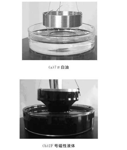 力敏傳感器定標(biāo)數(shù)據(jù)見(jiàn)表1,使用Origin軟件對(duì)直線進(jìn)行擬合,可得力敏傳感器靈敏度B=7.727V/N.測(cè)量無(wú)外加磁場(chǎng)作用的磁性液體表面張力系數(shù)時(shí),為直觀觀察拉脫時(shí)液膜的變化過(guò)程,將培養(yǎng)皿放置于電磁線圈端部進(jìn)行測(cè)量,圖3為拉脫過(guò)程中某一瞬間液膜的收縮狀態(tài),從圖中可看到,磁性液體的液膜拉得更長(zhǎng),液膜收縮的趨勢(shì)比白油更明顯,這主要是因?yàn)榇判砸后w中加入的表面活性劑降低了其表面張力??蓮谋砻鎻埩π纬稍韥?lái)分析其中的原因:第一,液體表面張力系數(shù)的大小宏觀上反映出液體表面具有自動(dòng)收縮的趨勢(shì),表面張力系數(shù)較大的白油由于分子和分子之間的引力較大,表面層分子更容易向液體內(nèi)部運(yùn)動(dòng),某一拉力作用下,液膜斷裂,不易拉起較長(zhǎng)的液膜;第二,不同液體對(duì)同一種固體的浸潤(rùn)程度不一樣,表面張力系數(shù)小的液體(0.03N/m左右),幾乎能浸潤(rùn)一切固體;表面張力系數(shù)較大的液體,只能浸潤(rùn)某些固體;7#白油的表面張力系數(shù)大于磁性液體,片狀吊環(huán)和磁性液體的結(jié)合力大于片狀吊環(huán)和7#白油的結(jié)合力;液膜不容易和片狀吊環(huán)脫離,拉起來(lái)的液膜比較長(zhǎng)。