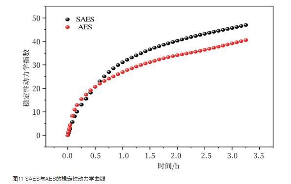 穩(wěn)定性動(dòng)力學(xué)指數(shù)(di)反映的是樣品在整個(gè)放置時(shí)間濃度和顆粒粒徑的變化幅度的綜合值,穩(wěn)定性動(dòng)力學(xué)指數(shù)越大,系統(tǒng)越不穩(wěn)定。圖11為SAES與AES的穩(wěn)定性動(dòng)力學(xué)曲線,從圖中可以看出,在開(kāi)始的0.5 h內(nèi),SAES與AES的穩(wěn)定性動(dòng)力學(xué)指數(shù)幾乎相同,但隨著時(shí)間的增加,SAES的穩(wěn)定性動(dòng)力學(xué)指數(shù)明顯高于AES,說(shuō)明在開(kāi)始的0.5 h內(nèi),二者的泡沫穩(wěn)定性幾乎相同,但是隨著時(shí)間的延長(zhǎng),SAES體系的穩(wěn)泡性明顯弱于AES,這是由于帶有一定支鏈的SAES分子在氣-液界面上形成的表面膜黏度低,不夠緊密結(jié)實(shí),泡沫穩(wěn)定性較差。