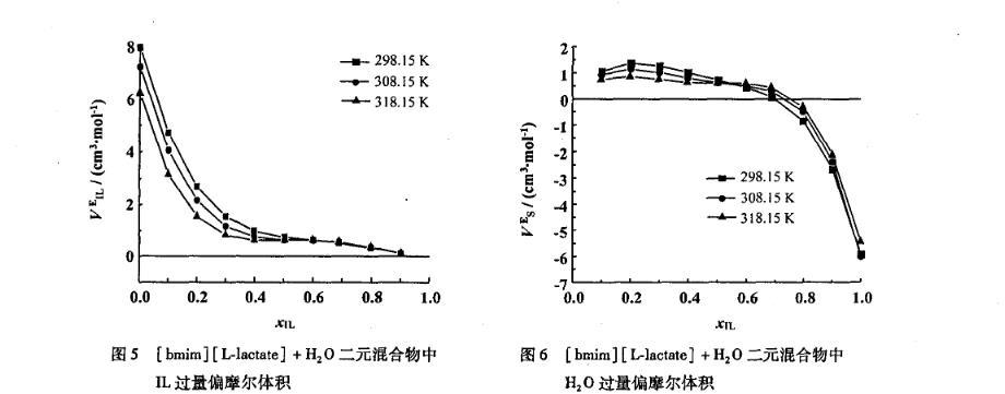 圖5[bmim][L-lactate]+H2 O二元混合物中IL過量偏摩爾體積
