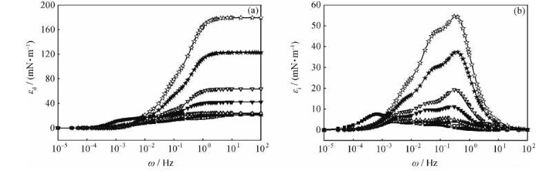 當頻率較低時,界面張力梯度在實驗時間內(nèi)幾乎可以完全消除,由于界面形變所造成的能量變化幾乎完全耗散在環(huán)境中,對擴張模量的貢獻可以忽略,εi接近于零;當頻率較高時,各種弛豫過程來不及發(fā)生,對擴張模量的影響也可以忽略,εi仍然接近于零;只有在適宜的頻率范圍內(nèi),εi隨頻率變化而變化,并在其弛豫過程的特征頻率處出現(xiàn)極大值。