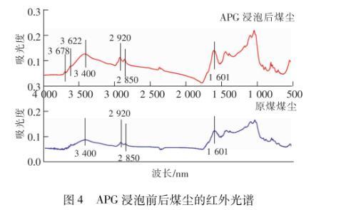 由上述實(shí)驗(yàn)結(jié)果可以看到,在8種表面活性劑中,非離子表面活性劑APG形成膠束和降低表面張力的能力最強(qiáng),潤(rùn)濕煤塵效果最好。通過(guò)測(cè)定APG浸泡前后煤塵表面官能團(tuán)及粒徑分布特征的變化,分析其潤(rùn)濕煤塵的作用機(jī)理。