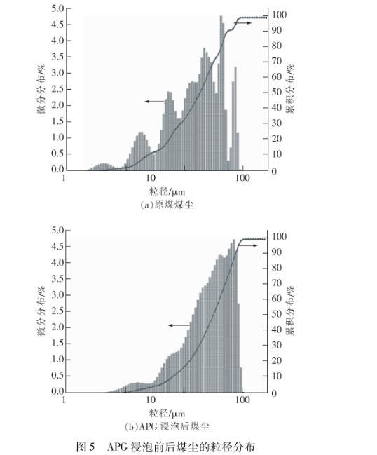 由圖5可見(jiàn),經(jīng)APG浸泡后煤塵粒徑增大。原煤煤塵的平均粒徑為22.62μm,經(jīng)APG浸泡后增大到3518μm。浸泡前煤塵的粒徑分布不均勻,粒徑眾數(shù)為48.41μm,浸泡后煤塵粒徑的均一性增強(qiáng),呈較典型的正態(tài)分布,粒徑眾數(shù)也增大至76.51μm。這說(shuō)明煤塵表面親水官能團(tuán)的增加和分子間締合氫鍵的形成,促使煤塵之間發(fā)生了團(tuán)聚作用,使原本無(wú)法發(fā)生重力沉降的“小粒徑”煤塵變成了能夠發(fā)生重力沉降的“大粒徑”顆粒,加快了沉降速率,縮短了沉降時(shí)間,與煤塵沉降實(shí)驗(yàn)結(jié)果一致。