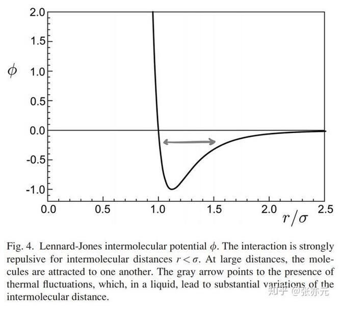 為了從源頭上理解毛細現象和表面張力,我們首先要考慮的就是液體分子間的作用力。事實上,一對液體分子間的作用力要么是引力,要么是斥力,與兩分子間距離相關,一般可用Lennard-Jones勢能表示(圖4)。