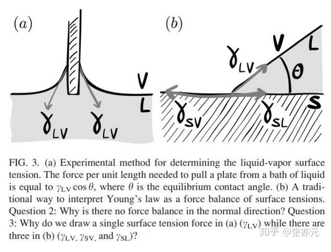 測量液-氣表面張力的標準方法是測量將金屬板拉出水面的力,這個力與表面張力γLV相關(圖3a)。而對楊氏方程(圖3b),一般認為在接觸線處存在三個界面張力在固-液界面方向的力平衡γSL+γLVcosθ=γSV。初學者在此處會有以下困惑: