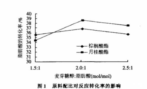 由圖1可知,在原料配比麥芽糖醇:脂肪酸酸分別使用1.5:1、2:1、2.5:1進(jìn)行反應(yīng)時(shí),麥芽糖醇:脂肪酸為2:1時(shí),脂肪酸的反應(yīng)轉(zhuǎn)化率是最好的,但是,結(jié)果相差不大。即在本實(shí)驗(yàn)條件下原料配比對反應(yīng)的影響較小。分析原因,是因?yàn)辂溠刻谴己椭舅釣榛ゲ幌嗳荏w系,在反應(yīng)中,用丙酮做溶劑,即使能建立一個(gè)均相的反應(yīng)體系,由于麥芽糖醇在丙酮中的溶解度比較小,溶液中隨麥芽糖醇的量增加而改變不大。而當(dāng)麥芽糖醇達(dá)到一定用量后,會破壞原有的平衡,導(dǎo)致脂肪酸反應(yīng)的轉(zhuǎn)化率降低。所以,反應(yīng)中選擇麥芽糖醇:脂肪酸的配比為2:1為反應(yīng)的最佳配比。