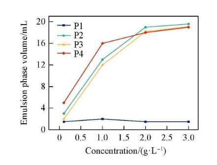 圖7示出4種表面活性劑對(duì)液體石蠟的乳化能力隨濃度的變化關(guān)系。P1由于較短的聚氧乙烯鏈段導(dǎo)致較差的親水性和乳化能力。隨著濃度的增加,P2,P3和P4的乳化性能逐漸提升,這是由于吸附在油/水界面上的表面活性劑分子數(shù)量隨著濃度的增加而增多,使分子形成的聚集體在界面處排列得更緊密,生成更致密、更剛性的油/水界面膜,從而使乳狀液也更加穩(wěn)定。具有長(zhǎng)聚氧乙烯鏈的表面活性劑乳化性能更好,這是因?yàn)榫垩跻蚁╂湹目臻g排斥作用可以防止乳液液滴聚并,有利于穩(wěn)定液滴。
