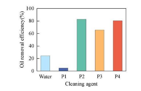 為探究表面活性劑在清洗領(lǐng)域的應(yīng)用,測(cè)試了4種表面活性劑對(duì)油污的去除能力。在超聲清洗之前,油污的質(zhì)量為41 mg.超聲清洗后,去離子水除去10 mg油污,去污效率為24.4%;P1由于溶解性差,在水溶液中大部分都不能溶解,導(dǎo)致去污效率很差,僅為4.9%;P2,P3和P4分別除去34,27和33 mg油污,去污效率分別達(dá)到82.9%,65.8%和80.5%,遠(yuǎn)遠(yuǎn)高于去離子水的去污效率(圖9)。因此,P2,P3和P4表面活性劑有著良好的去污性能,進(jìn)一步說明其在清洗領(lǐng)域有巨大的應(yīng)用潛力。