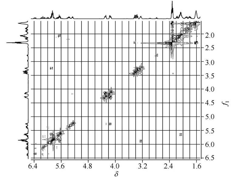 桐油及桐油酸酐的1H NMR見(jiàn)圖2,從圖中可以看出,隨著加成反應(yīng)的進(jìn)行,桐油中的烯鍵上的氫信號(hào)(8~13),TM2烯鍵上的氫信號(hào)(11~17)及TM3烯鍵上的氫信號(hào)(11~13)明顯減弱,峰型也發(fā)生很大變化。依據(jù)圖2(b)中的各峰積分面積比例確定桐油與兩個(gè)馬來(lái)酸酐反應(yīng)形成TM2,進(jìn)一步與馬來(lái)酸酐反應(yīng),共軛三烯的氫信號(hào)[圖2(b)中14~17]完全消失。由于桐油結(jié)構(gòu)較復(fù)雜,1H NMR歸屬較困難,TM 2經(jīng)1H-1H COSY譜(圖3)分析,從圖3中可以看出,信號(hào)3和6相關(guān),為甘油酯緊連的兩個(gè)亞甲基氫;6′和8相關(guān),為新生成的六元環(huán)相鄰的兩個(gè)氫;5和5′分別與12和12′相關(guān),7和13、13′相關(guān),9和10相關(guān),11和14相關(guān),14和17相關(guān),12、17與15、16相關(guān)。結(jié)合圖2(b)、圖2(c)中信號(hào)7、8、9的積分比例分別為1∶2∶2及3∶6∶4,及TM2的1H-1H COSY譜分析,TM2及TM3結(jié)構(gòu)各質(zhì)子信號(hào)歸屬如圖2所示。
