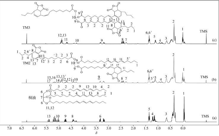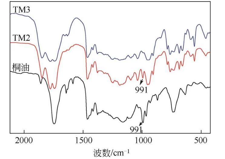 桐油中的共軛不飽和鍵與馬來(lái)酸酐易發(fā)生Diels-Alder(D-A)反應(yīng),生成桐油酸酐,反應(yīng)條件對(duì)產(chǎn)物的分布具有重要影響。由于桐油為混合物,每分子中有3條不飽和鏈,控制MA的加入量及反應(yīng)條件,可以控制桐油二酸酐(TM2)和桐油三酸酐(TM3)的形成。文獻(xiàn)報(bào)道大多數(shù)桐油和馬來(lái)酸酐反應(yīng)以有機(jī)錫為催化劑,經(jīng)過(guò)研究發(fā)現(xiàn),溫度對(duì)馬來(lái)酸酐與桐油反應(yīng)影響較大,溫度低反應(yīng)很慢,有機(jī)錫催化劑并不能明顯降低反應(yīng)溫度。在無(wú)催化劑的條件下,以紅外光譜跟蹤80℃、100℃、120℃及140℃下桐油與3倍量的馬來(lái)酸酐反應(yīng)的情況,結(jié)果表明80℃下反應(yīng)緩慢,100℃反應(yīng)1h后桐油的共軛三鍵的紅外吸收峰幾乎完全消失,反應(yīng)程度能達(dá)到96%。桐油及桐油酸酐的FTIR如圖1所示,991cm–1為桐油共軛三鍵的面外彎曲振動(dòng)紅外吸收峰,兩倍量馬來(lái)酸酐與桐油反應(yīng)的產(chǎn)物(TM2)中991cm–1的吸收峰明顯減弱但未消失,3倍量馬來(lái)酸酐與桐油反應(yīng)的產(chǎn)物中該峰完全消失,說(shuō)明桐油分子上的共軛三鍵可以同馬來(lái)酸酐反應(yīng)形成三酸酐TM3。