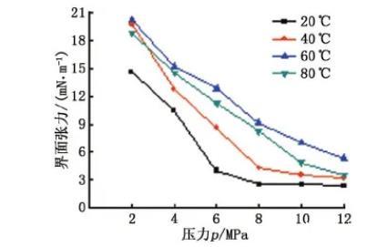 (2)溫度對界面張力的影響。溫度對界面張力的影響見圖6。可以看出,當體系壓力一定,體系界面張力隨著溫度的升高而增大,說明溫度的升高不利于體系界面張力的降低。原因在于CO2乳液是熱力學不穩定體系,隨著溫度的升高,CO2本身的溶解度系數和密度均有所降低,分子熱運動的加劇也不利于界面上AOT分子的吸附,導致界面處的AOT分子數目降低,最終導致體系界面張力升高。