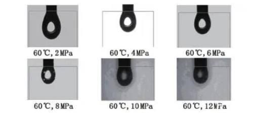 表面活性劑水溶液液滴在CO2中的形狀隨溫度變化較小,隨壓力變化關系見圖4。