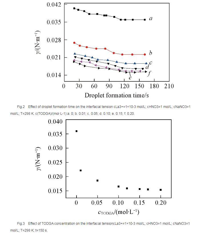考察了以正辛烷作稀釋劑時,不同TODGA濃度體系的界面張力隨液滴形成時間的變化情況。從圖2可以看出,對于不同TODGA濃度(包括不添加TODGA)的體系,界面張力均隨著時間的延長逐漸降低,約在120 s時基本達(dá)到界面吸附平衡,可以認(rèn)為萃取過程在此時間段內(nèi)基本完成;液滴形成時間相同時, TODGA濃度越大,體系的界面張力值越小,即不同濃度下達(dá)到界面吸附平衡的濃度不同,表明不同TODGA濃度體系界面物種成分不同。