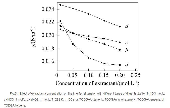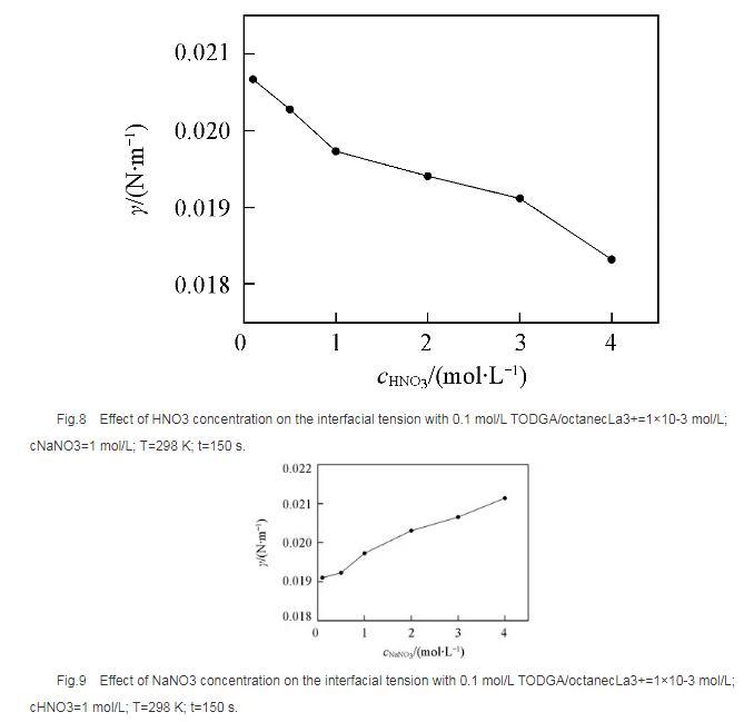 如圖8所示,以正辛烷作為稀釋劑時, TODGA/HNO3萃取La3+的界面張力隨著硝酸濃度的升高逐漸降低。根據(jù)文獻報道,在硝酸體系中, 3-氧戊二酰胺類萃取劑能夠萃取硝酸,萃取過程中隨著硝酸濃度升高,萃取分配比明顯增大。因此,硝酸濃度較高時TODGA與硝酸發(fā)生萃取締合作用,使中性萃取劑TODGA質(zhì)子化,其界面活性明顯增強,導(dǎo)致界面張力迅速降低,這與圖3結(jié)果一致。