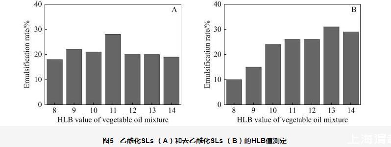 圖5乙酰化SLs(A)和去乙酰化SLs(B)的HLB值測(cè)定