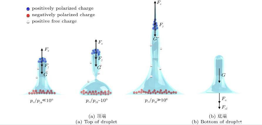 圖4(a)為液滴頂端所受力的方向和液滴整體電荷分布。液滴接觸下極板后,由于離子遷移和極化電荷的產(chǎn)生,中性液滴立即極化,其頂部帶正電荷,底部帶負(fù)電荷。根據(jù)庫(kù)倫定律,電場(chǎng)方向垂直向上,作用在液滴頂部的靜電力Fe是向上的,與電場(chǎng)方向相同,使液滴不斷向上拉伸,液滴拉伸高度增加,而表面張力Fγ和重力G使液滴向下收縮。基于上述的分析,各個(gè)模態(tài)的產(chǎn)生機(jī)理均可通過(guò)靜電力、表面張力和重力三者間的博弈關(guān)系來(lái)分析。三種作用力對(duì)液滴的影響大小可用局部靜電應(yīng)力pe、毛細(xì)應(yīng)力pγ和重力應(yīng)力pg來(lái)表示。靜電力的大小由麥克斯韋應(yīng)力張量T的散度給出,可表示為