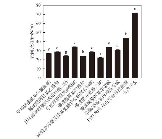 將10種表面活性劑的去離子水溶液(pH=6.0)進(jìn)行表面張力測定,結(jié)果如圖1所示。去離子水的表面張力為71.81 mN/m;所有表面活性劑均可顯著降低去離子水的表面張力,其中PEG-80失水山梨醇月桂酸酯降低表面張力的能力最差,為43.73 mN/m;月桂醇聚醚硫酸酯鈉和椰油酰胺丙基甜菜堿水溶液的表面張力無顯著差異,分別為34.14和33.87 mN/m;辛酰/癸酰氨丙基甜菜堿水溶液的表面張力為30.54 mN/m;椰油酰兩性基乙酸鈉和磺酸羥丙酯月桂基葡糖苷交聯(lián)聚合物鈉水溶液的表面張力無顯著差異,分別為28.88和28.71 mN/m;甲基椰油酰基牛磺酸鈉水溶液的表面張力為26.74 mN/m;月桂醇聚醚磺基琥珀酸酯二鈉水溶液的表面張力為24.16 mN/m;椰油酰氨基丙酸鈉水溶液的表面張力較低,為23.84 mN/m;椰油酰谷氨酸二鈉水溶液的表面張力最低,為22.08 mN/m。