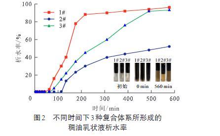 圖2不同時間下3種復合體系所形成的稠油乳狀液析水率
