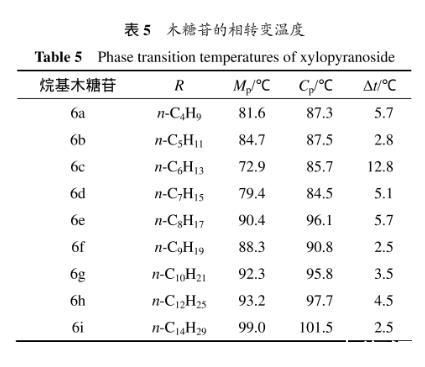具有液晶特征的化合物因加熱而呈現(xiàn)所謂的“雙熔融轉(zhuǎn)變”的相變現(xiàn)象,當(dāng)加熱達(dá)到其熔點(diǎn)(p)時(shí),結(jié)晶性的固態(tài)首先轉(zhuǎn)變成半透明的液晶態(tài),接著在較高的溫度(p)下轉(zhuǎn)變成各向同性的清亮的液態(tài)。表5所示為木糖苷的相轉(zhuǎn)變溫度。從表5可見:烷基-β-D-吡喃木糖苷屬于一頭一尾(one head one tail)或一頭組一鏈(one head group-one chain)且呈現(xiàn)多態(tài)性的雙親吡喃糖苷分子,在加熱時(shí)其相變發(fā)生在相對較小的溫度區(qū)間,但都出現(xiàn)了液晶相,且當(dāng)疏水性烷基碳鏈長度為6時(shí),烷基-β-D-吡喃木糖苷相變溫度之差(Δ)較大,其他的都比較接近。在木糖苷中,烷基有助于提升分子取向的穩(wěn)定性,且這種穩(wěn)定性對液晶相的生成是必要的。但由于烷基-β-D-吡喃木糖苷為環(huán)狀的糖苷只有3個(gè)游離羥基,比烷基--D-吡喃葡萄糖苷少了親水性頭部的糖環(huán)上的羥甲基,也比木糖醇的十二烷基單醚少了1個(gè)游離的羥基,清亮點(diǎn)p不高,所以,得到的烷基-β-D-吡喃木糖苷具有液晶相,但相變溫度范圍(?=p?p)較窄,液晶相的穩(wěn)定性較弱。