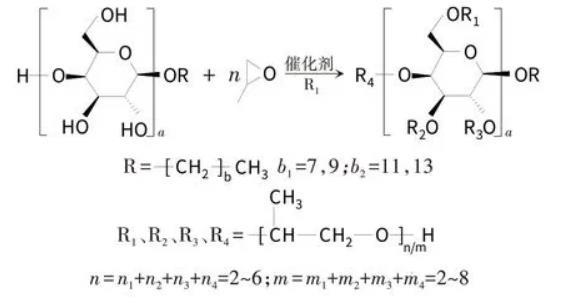 制備路線:烷基糖苷分子中含4個羥基,與環氧丙烷在催化劑作用下發生反應: