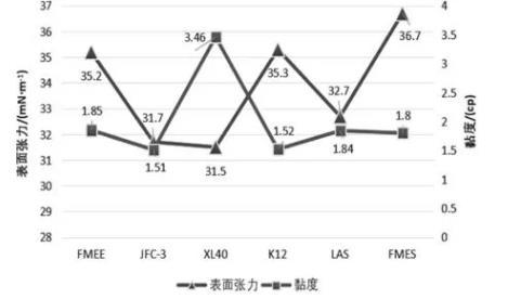 對比圖2中不同種類活性劑溶液的表面張力和黏度可以得出,FMES的表面張力數值最高(36.7mN·m-1),XL40的黏度數值最高(3.46cp),可見這兩種活性劑都不是最優的表面活性劑。活性劑FMEE與K12的表面張力數值相近,僅差了0.1mN·m-1,但其溶液的表面張力較高,無法滿足條件要求。活性劑XL40的表面張力最低,僅為31.5mN·m-1,但由于其黏度最高為3.46cp,綜合來說效果不佳。綜合表面張力與黏度雙重作用效果,活性劑JFC-3與其他活性劑相比占有明顯優勢,故選擇非離子表面活性劑JFC-3進行后續研究。