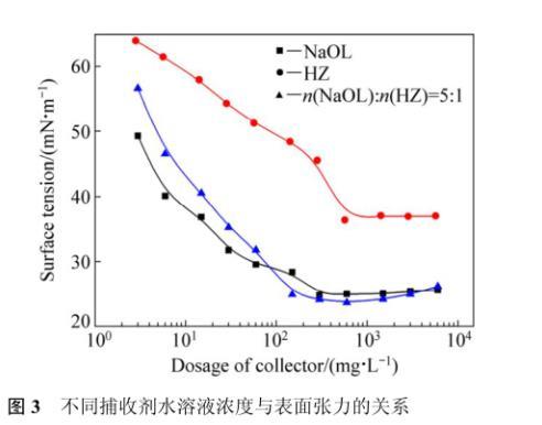 表面張力是影響浮選過程中氣泡的穩定性,以及氣泡形成難易程度的主要參考數據,臨界膠團濃度(簡稱CMC)是反映表面活性劑降低水溶液表面張力的效率。組合用藥的浮選效果優于單一用藥,這可能與其在水溶液中的表面張力有一定的關系。圖3所示為最佳pH條件下(pH=9.0)組合捕收劑與兩種單一捕收劑的水溶液濃度與表面張力的關系。NaOL在水中微量的添加顯著地降低了水的表面張力,而隨著NaOL濃度的增加,溶液的表面張力逐漸下降,在濃度為302 mg/L時溶液的表面張力達到最低,為22.7~24.8 mN/m。此后NaOL濃度的增加并不能顯著地降低水的表面張力,所以可以確定NaOL的CMC值約為302 mg/L,與文獻中報道的1.03×10?3mol/L(308 mg/L)接近。而HZ的CMC值568 mg/L,表面張力36.37 mN/L。作為一種表面活性劑,其表面活性明顯不如NaOL,在較高濃度下,HZ才能形成膠團。浮選HZ用量為200 mg/L,低于其CMC值,在此濃度下,膠團未形成,表面張力較高,起泡性不佳,在單礦物浮選試驗中表現出了泡沫量小的特點。組合捕收劑水溶液的表面張力測試結果表明,CMC值約為150 mg/L,CMC值下水溶液表面張力為24.88 mN/m。可見HZ的添加能降低NaOL的CMC值,這可能是NaOL作為一種陰離子型表面活性劑,親水“離子頭”之間的靜電作用較強,非離子表面活性劑的“插入”到親水“離子頭”之間,同時亞氨基也存在一定程度的解離,使得離子之間的靜電斥力減小。
