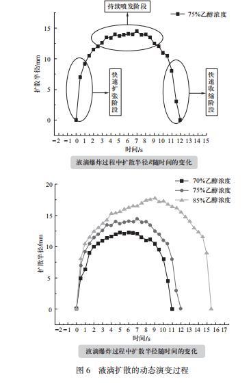 實驗1探究液滴擴散的動態演變過程就是將前文用文字性描述的液滴擴散現象定量處理,用數據清晰的看出液滴爆炸過程中擴散半徑隨時間的變化,如圖6所示,可以從折線圖中直觀看出液滴爆炸的三個過程。