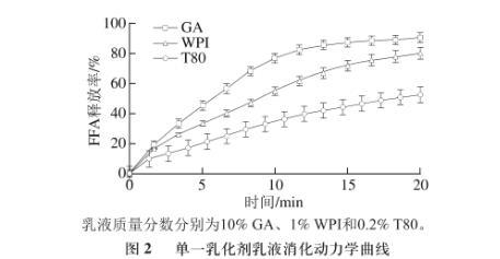 乳液粒徑大小是評價乳液物理特性的重要指標之一,可判斷乳化劑的乳化活性。在脂肪消化過程中,乳液的比表面積決定了膽鹽、脂肪酶在油-水界面的吸附位點,因此乳液粒徑大小對脂肪消化速率影響顯著。如圖1所示,10%GA、1%WPI和0.2%T80制備乳液的粒徑分布基本一致,可保證乳液液滴的比表面積一致,消除乳液粒徑對脂肪消化速率造成的影響。后續實驗均采用此乳化劑質量分數。