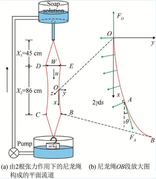 如圖1(a)所示,配制的皂液盛于上水箱中,經(jīng)一個狹長的出水管流出,進入一個由兩根直徑為0.32 mm的尼龍繩構(gòu)成的豎直平面流道(實驗中,尼龍繩一直處于下方砝碼施加的張力作用下)。緊接出水管口的流道為漸擴的擴張段,其下為流道寬度不變的實驗段和流道逐漸收窄的收縮段(在本文實驗中,擴張段長度X1=45 cm;實驗段長度X2=86 cm,實驗段入口寬度W=5 cm)。在擴張段,皂液在重力驅(qū)動下加速,當(dāng)重力和空氣阻力平衡時充分發(fā)展,最終在實驗段達到勻速運動,之后經(jīng)收縮段流入下水箱,再被泵回至上水箱,形成往復(fù)循環(huán)。