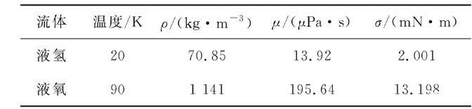 相較于常規推進劑,以液氫/液氧為代表的低溫推進劑具有高比沖、無毒、無污染等諸多優勢,是目前以及未來很長一段時間內空間工程的首選推進劑。然而,低溫推進劑沸點低、汽化潛熱低等特殊物性,為其長期空間貯存和在軌管理技術帶來巨大挑戰。因此,對于低溫推進劑,采用表面張力式流體液體管理裝置是解決其空間應用難題的關鍵突破點。基于前文的毛細流動模型,對液氫、液氧兩種流體的內角流動情況進行計算分析。液氫和液氧的物理性質參數如表1所示。為了與空間貯箱中的應用一致,采用低溫流體在不銹鋼表面上的接觸角(近似為0°)。