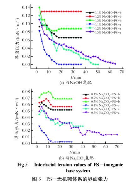 由圖6可以看出:PS-b與NaOH復(fù)配,原油的界面張力只可以降到10-2數(shù)量級,而PS-a與NaOH復(fù)配,可以將原油的界面張力降至10-4數(shù)量級;PS-b與Na2CO3復(fù)配,原油的界面張力可以降到10-2數(shù)量級;PS-a與Na2CO3復(fù)配,可以將原油的界面張力降至10-3數(shù)量級。綜上分析可以得出:PS-b的界面活性遠遠低于PS-a;PS-a的復(fù)配體系可以達到超低界面張力(10-3~10-4mN/m),而PS-b不能。