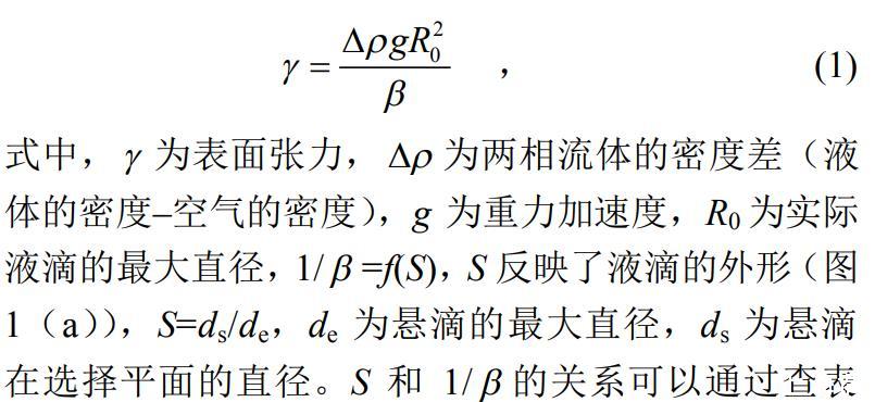試驗為比較3種液體表面張力的大小,采用懸滴法對液體的表面張力進行測量,懸滴法的基本原理是:處于毛細管端液體懸滴的形狀與液體的表面張力有關,在重力作用下,毛細管端形成的球形液滴的形變,隨著液滴有效密度的增加而增加并隨著液滴界面張力的增加而減小。通過Young–Laplace方程可以推導得到懸滴法計算表面張力的基本方程: