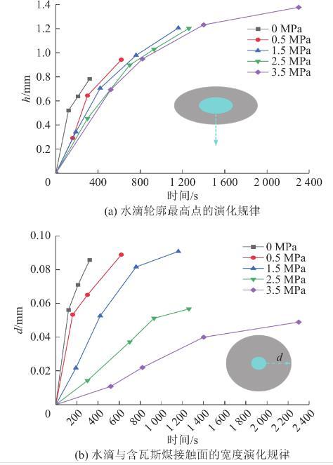 由圖9a可知,同一瓦斯壓力條件下,水滴輪廓最高點(diǎn)下降的高度逐漸增加,然而增加的速率逐漸減小,其主要是因?yàn)樗衷诿褐锌紫读鲃?dòng)所受的黏滯力所致。同一時(shí)間,瓦斯壓力越大,水滴輪廓最高點(diǎn)下降的高度越小。由前述分析可知,瓦斯壓力越大,水分對(duì)煤體潤(rùn)濕的難度越大,水分越難浸潤(rùn)含瓦斯煤體,因此呈現(xiàn)出瓦斯壓力越大,水滴輪廓最高點(diǎn)下降的高度越小的規(guī)律。由圖9b可知,同一瓦斯壓力條件下,水滴與含瓦斯煤接觸面的寬度逐漸增加,然而增加的速率逐漸減小,其主要也是因?yàn)樗衷诿褐锌紫读鲃?dòng)所受的黏滯力所致。同一時(shí)間,瓦斯壓力越大,水滴與含瓦斯煤接觸面寬度增加的越小,其說明瓦斯壓力越高,水分越不容易在含瓦斯煤表面鋪展。水滴與含瓦斯煤表面的接觸是一個(gè)動(dòng)態(tài)潤(rùn)濕的過程,基于對(duì)圖9a—圖9b的分析可知,瓦斯壓力的增加一方面不利于水分浸潤(rùn)到煤體中,另一方面不利于水分對(duì)煤體表面潤(rùn)濕范圍的增加。